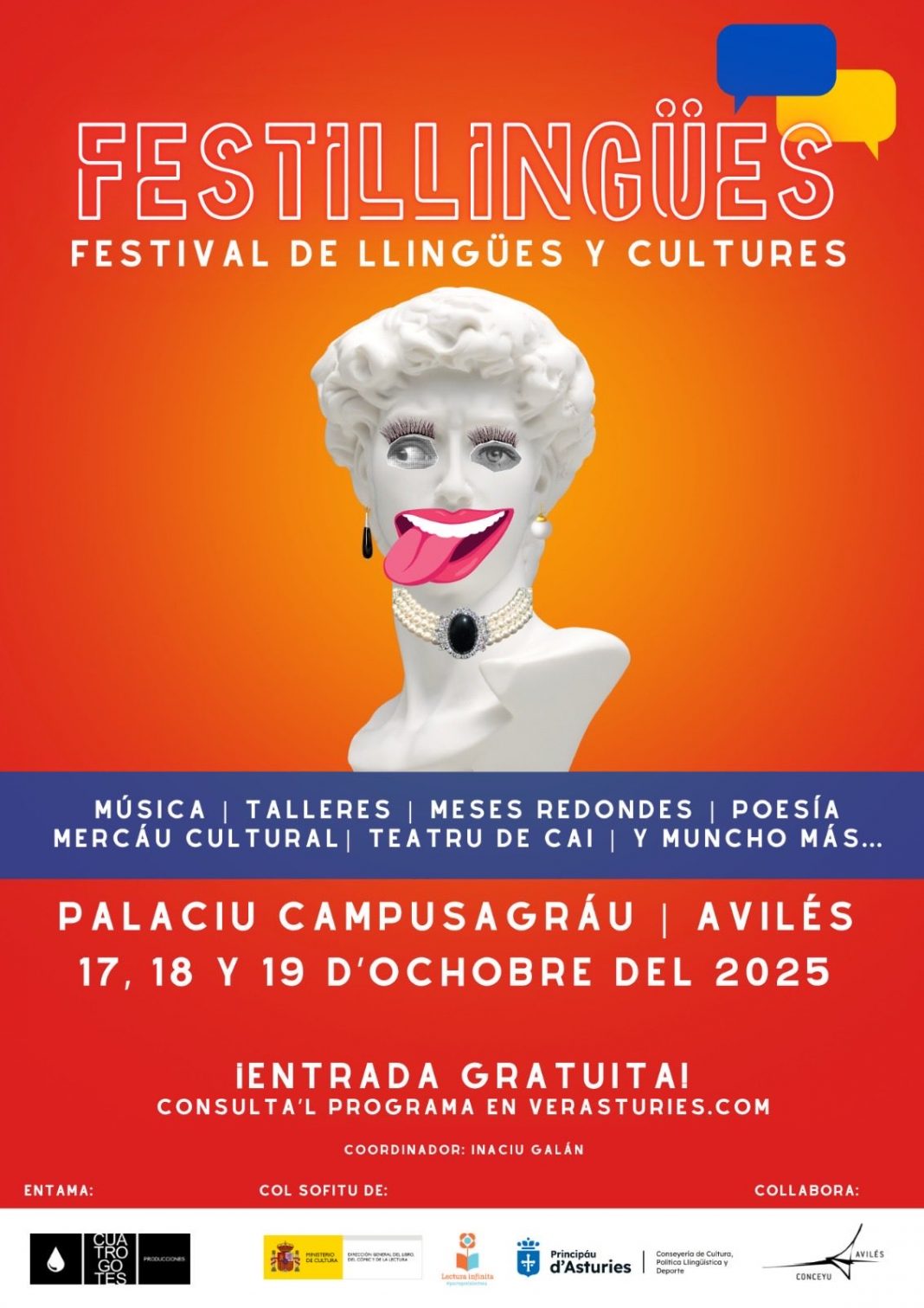 Avilés acoyerá los díes 17, 18 y 19 d’ochobre la primer edición de Festillingües, un alcuentru cultural que cuenta cola collaboración del Conceyu d’Avilés y que va tresformar el Palaciu de Campusagráu nun espaciu pal alcuentru, el diálogu y la folixa les llingües y les cultures.