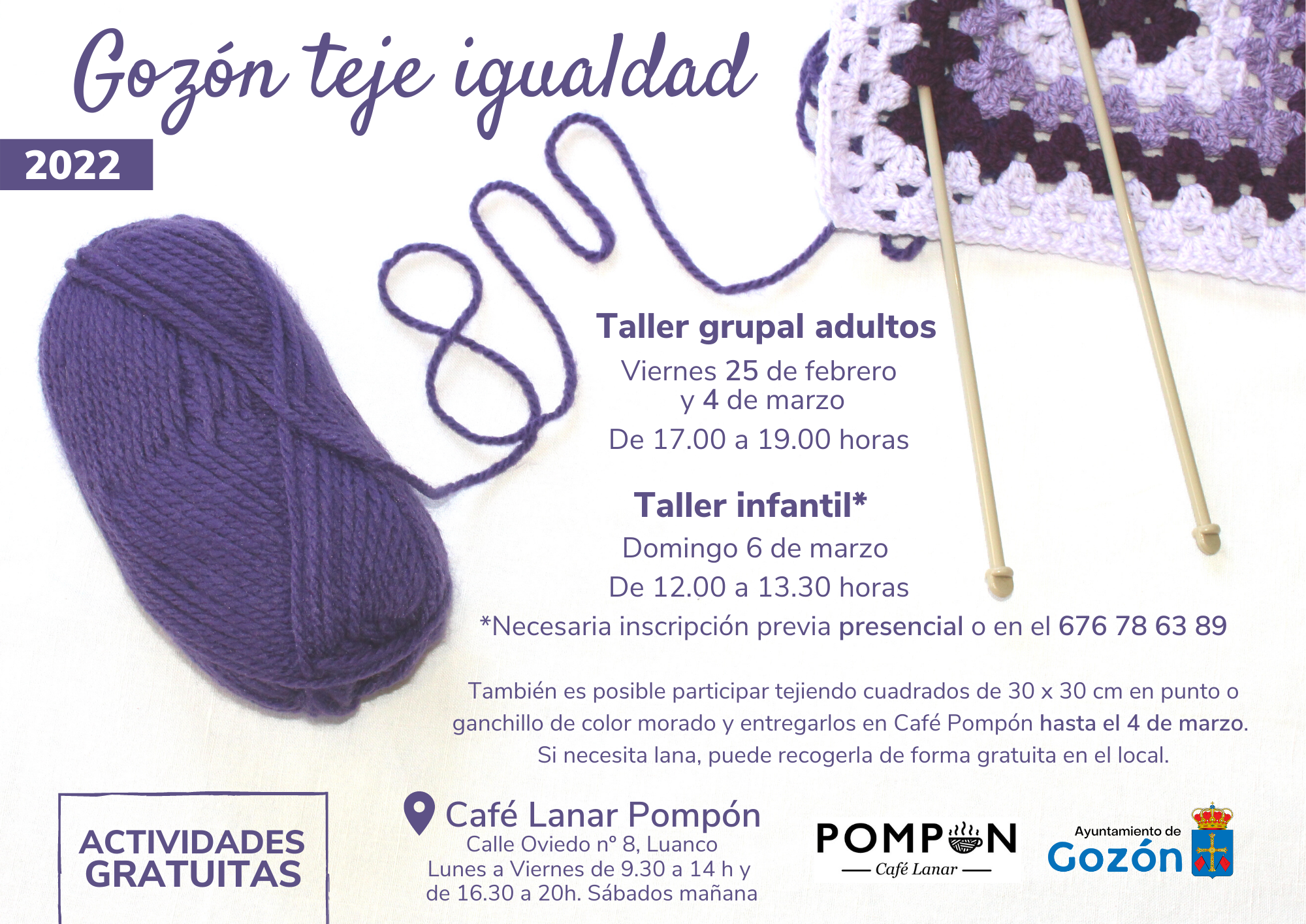 El Conceyu de Gozón y el Café lanar Pompón de Lluanco entamen una actividá creativa con motivu del Día Internacional de la Muyer sol lema ‘Gozón texe pola igualdá’. L’oxetivu ye consiguir el mayor númberu de cuadraos de 30×30 cm texíos con puntu o ganchiyu de color moráu pa darréu xuntalos y crear una única pieza que va decorar el 8 de marzu la zona arbolada próxima a la Casa Consistorial. Pa ello, van entamase dos talleres presenciales p’adultos nel local del café na cai Uviéu nº8, el vienres 25 de febreru y 4 de marzu de 17 a 19 hores y un taller infantil el domingu 6 de marzu de 12 a 13.30 hores. Colos neños y neñes tamién se van diseñar otros materiales como pompones, guirlandes y cartelos que van sirvir pa completar la creación principal y que se van asitiar en más puntos del conceyu.
