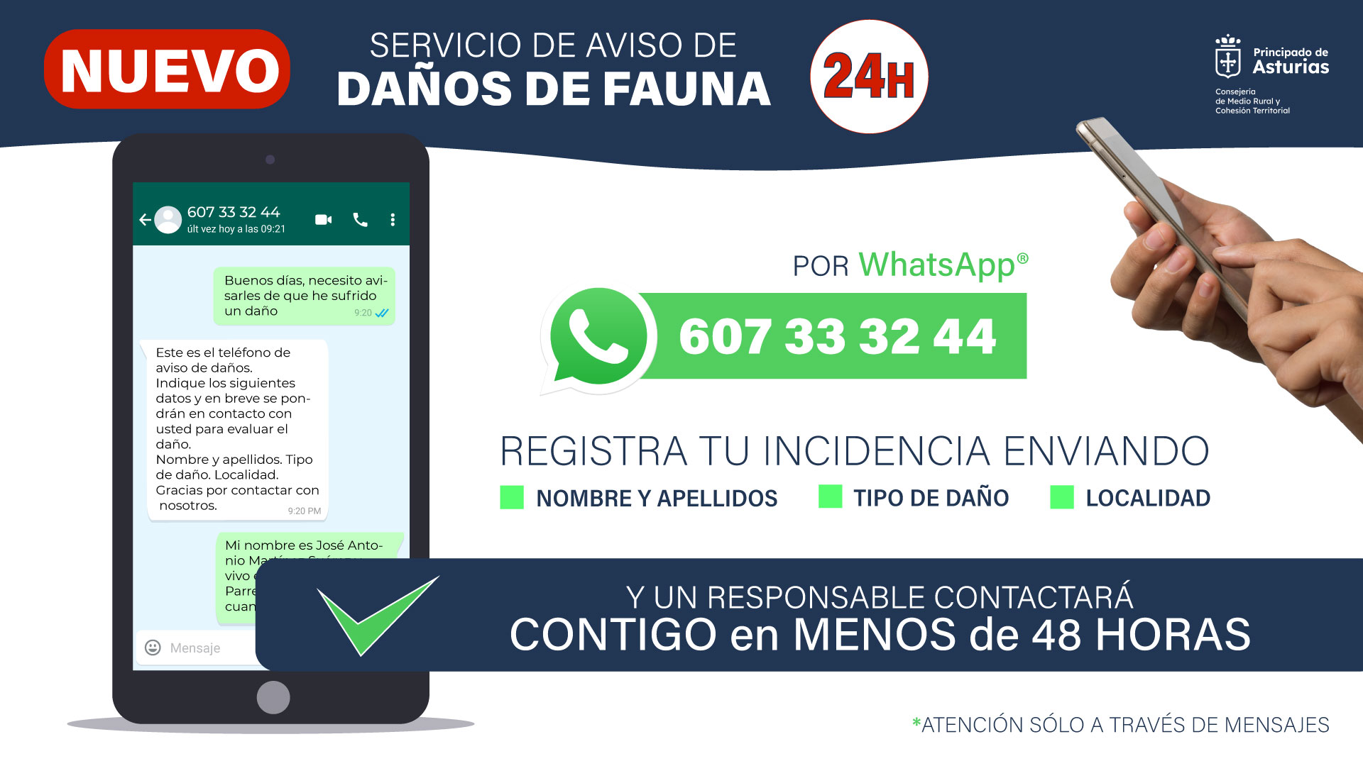 La Conseyería de Mediu Rural y Cohesión Territorial punxo en marcha un nuevu serviciu d’atención 24 hores pa echar voz de los daños producíos pola fauna montesa. El serviciu d’avisos utiliza l’aplicación de mensaxería WhatsApp, dexa una atención rápida y facilita que les persones comuniquen un dañu al traviés del teléfonu 607 333 244.