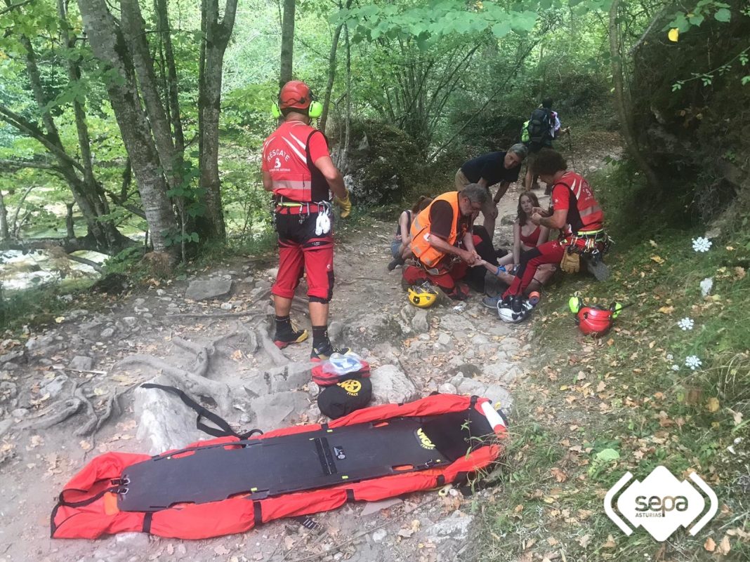 El Grupu de Rescate de Bomberos del Serviciu d’Emerxencies del Principáu d’Asturies (SEPA), a bordu del helicópteru medicalizado de Bomberos d’Asturies, treslladó al hospital de Les Arriondes a una muyer que resultó mancada nuna muñeca cuando realizaba la ruta de la Olla de San Vicente, en Cangues d’Onís.